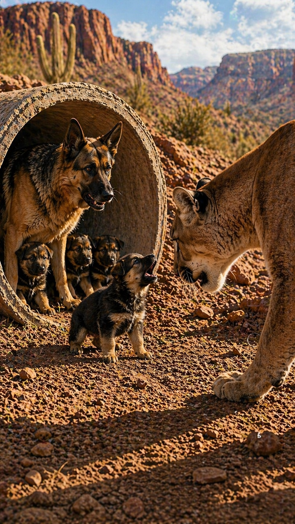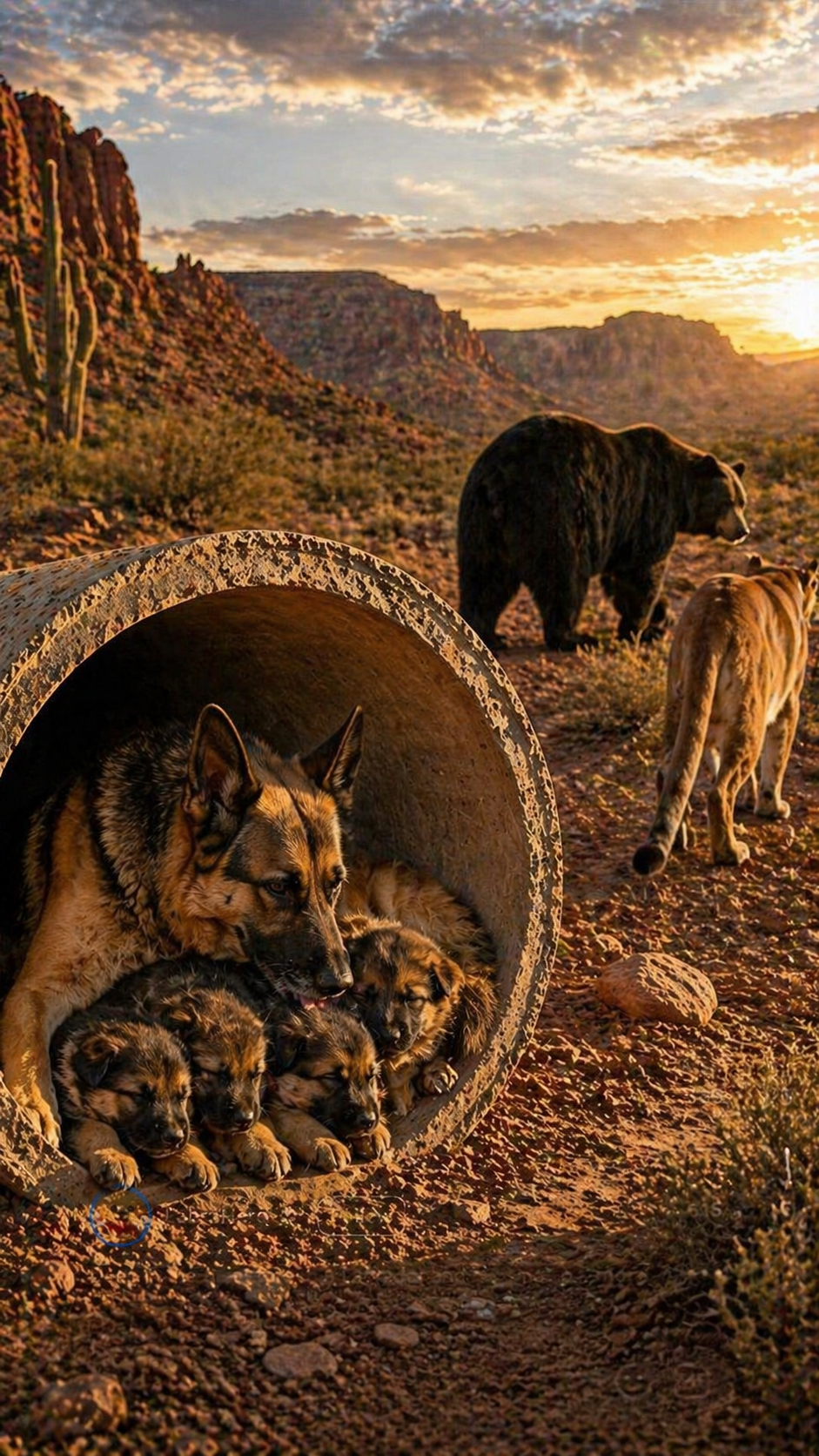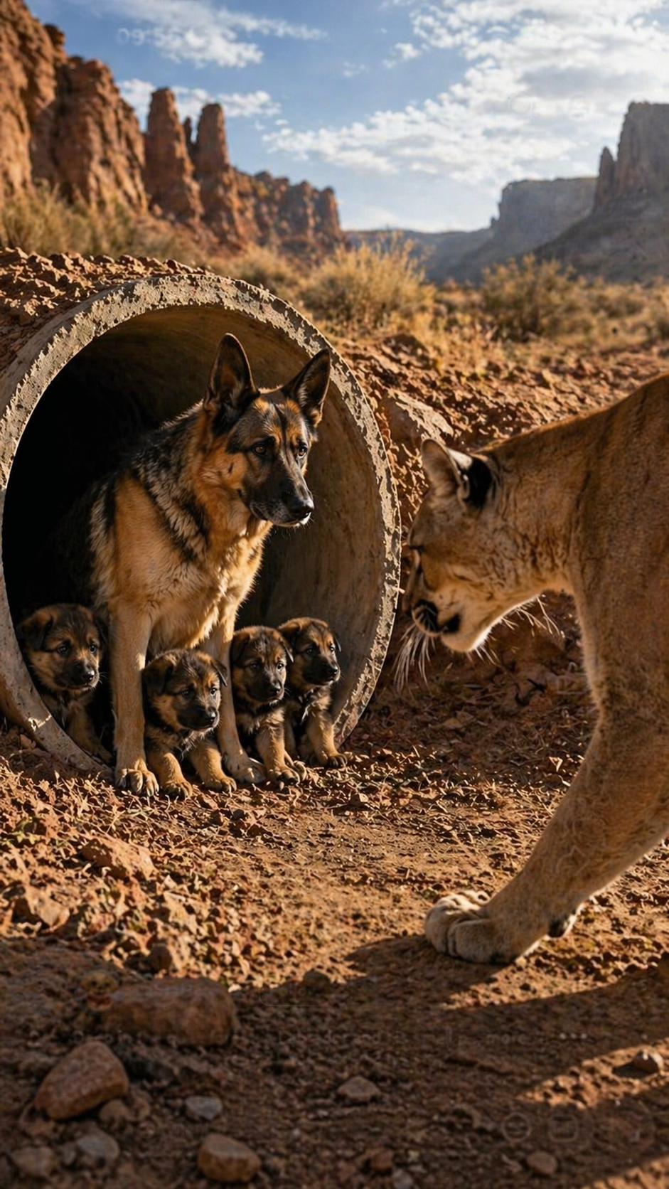 At the entrance of the old pipe, a German Shepherd stayed low, her body positioned carefully, not relaxed but controlled.