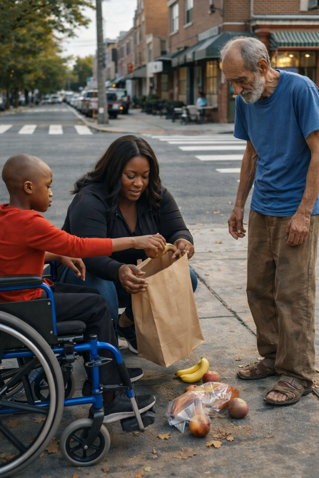 A woman approached from the corner, pushing a wheelchair.