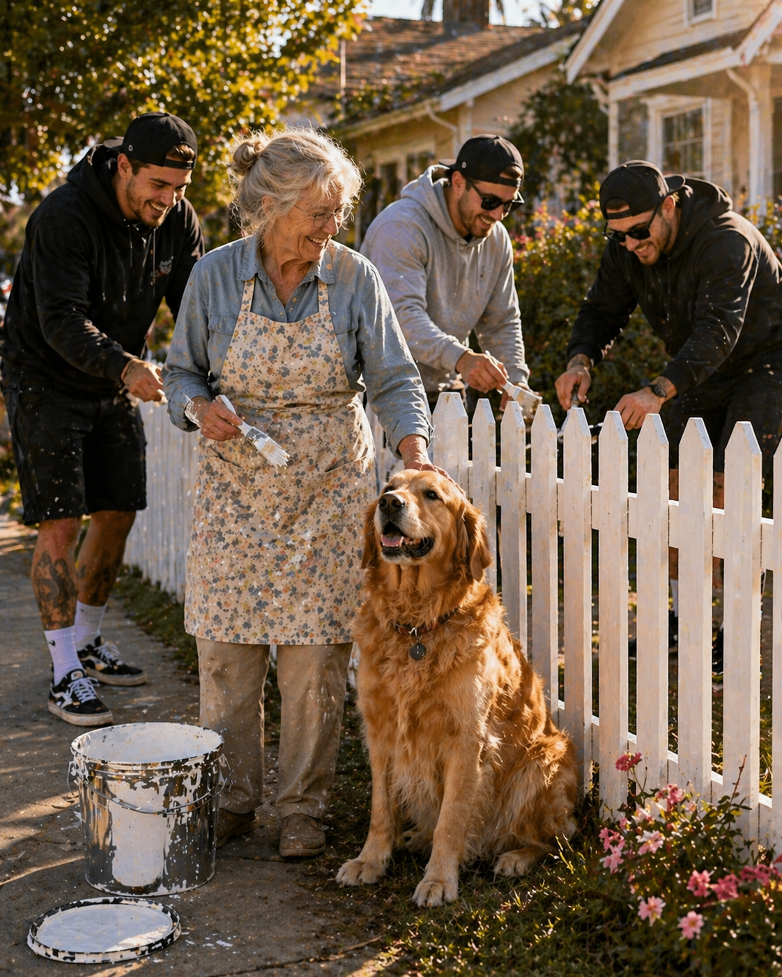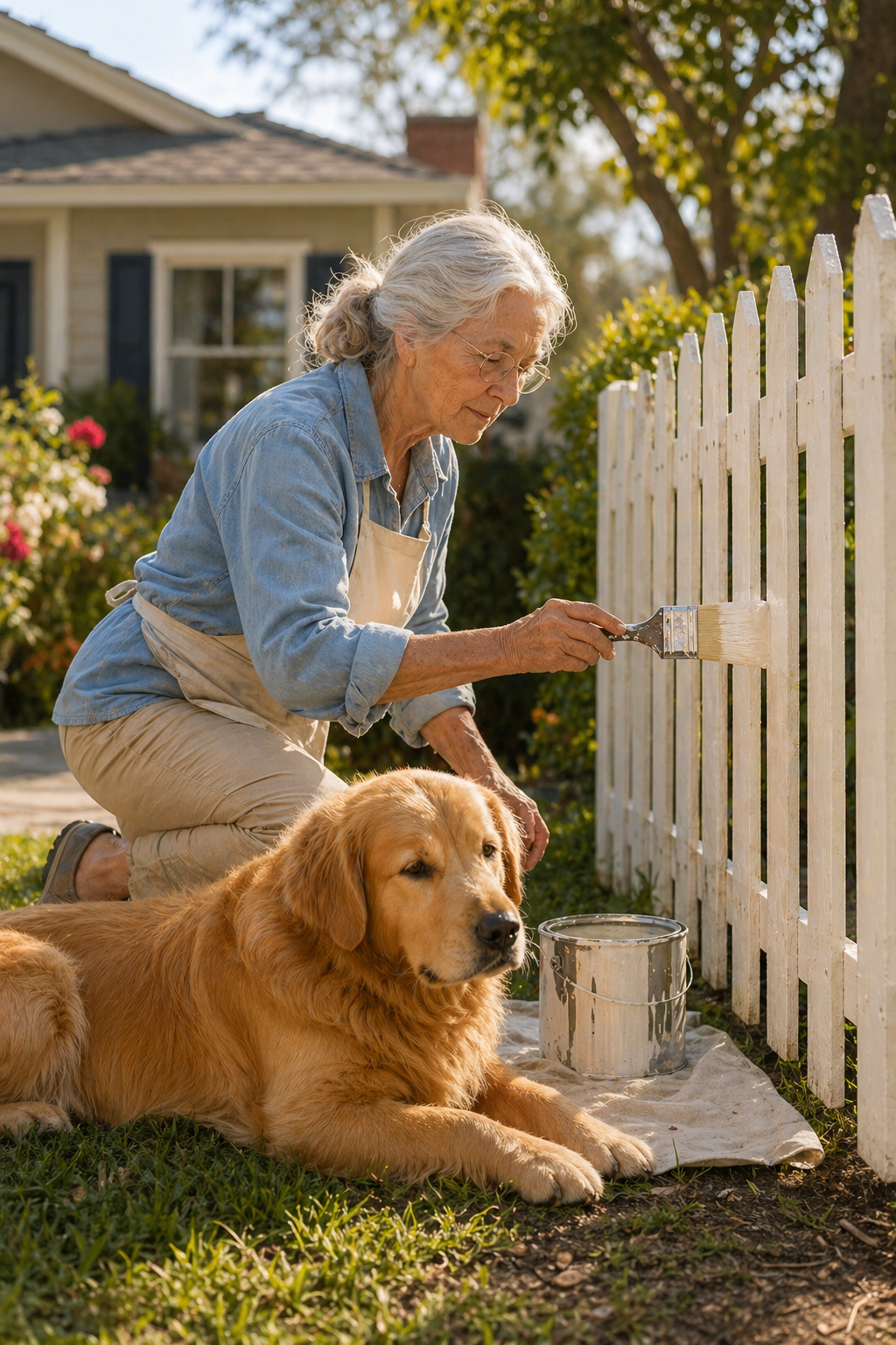 The elderly woman stood near her white fence, carefully painting each wooden board with slow, steady movements. She wasn’t rushing. She was simply doing what needed to be done, focused on the task in front of her.