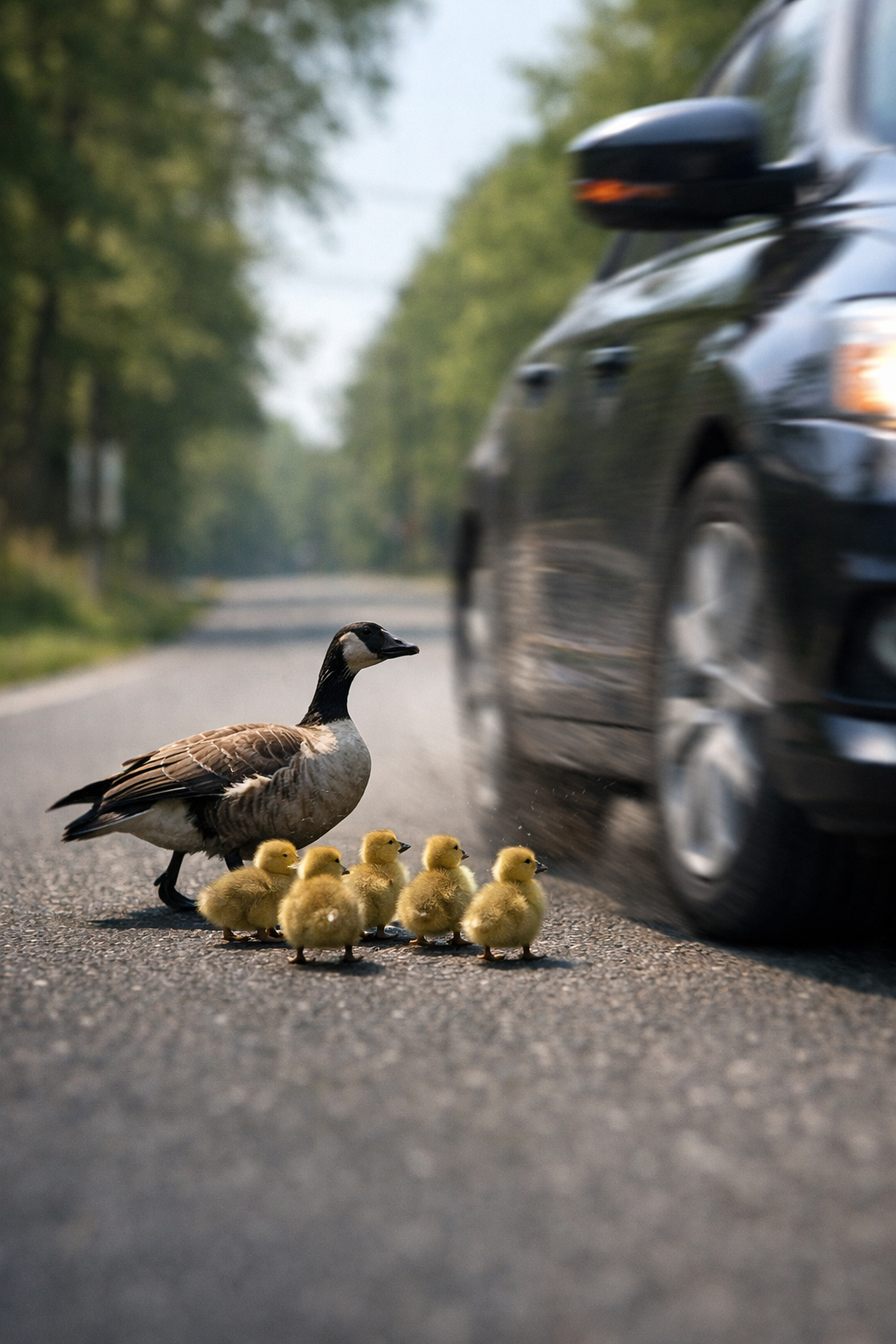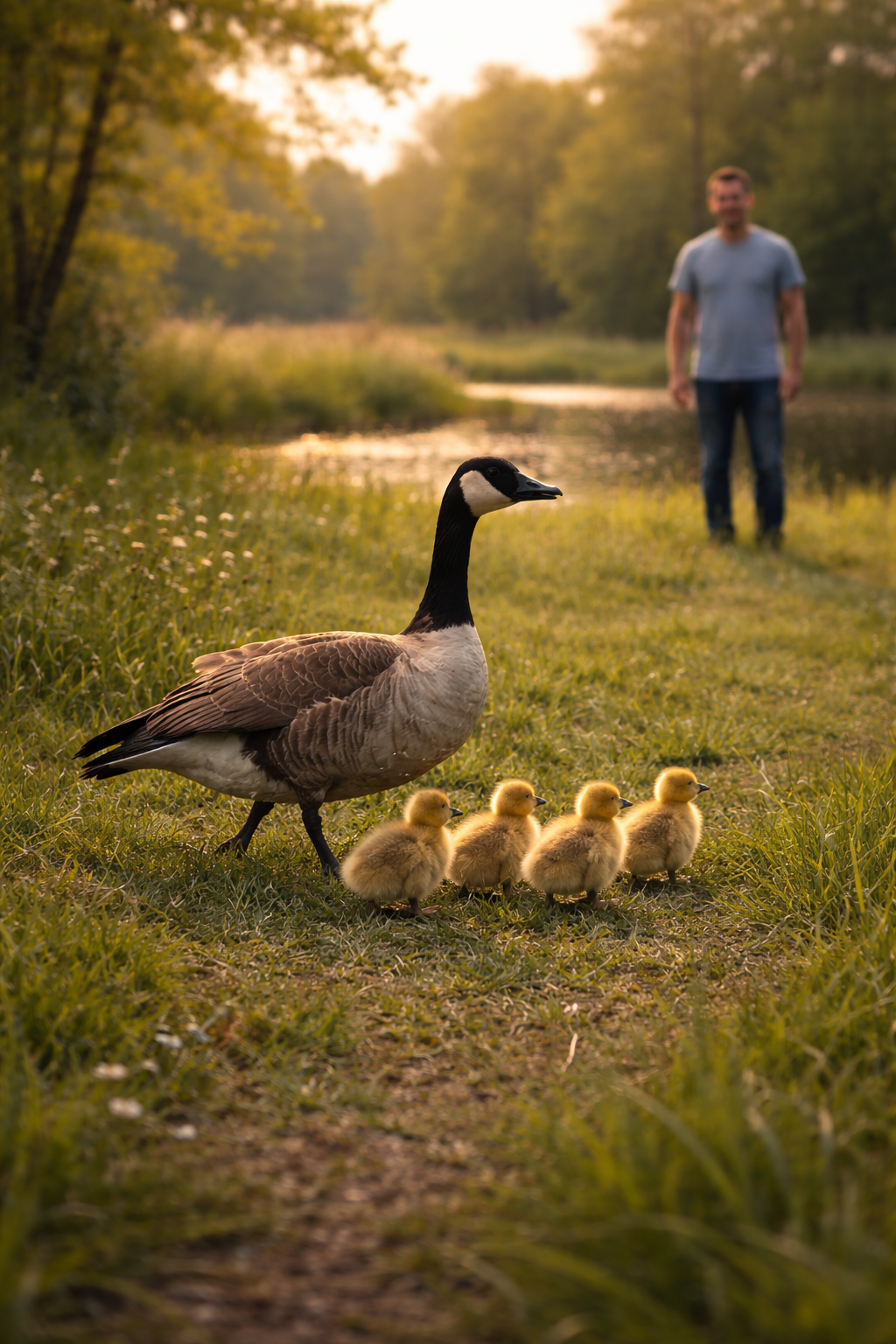 He knelt down carefully on the asphalt, moving slowly so he wouldn’t scare the goslings.