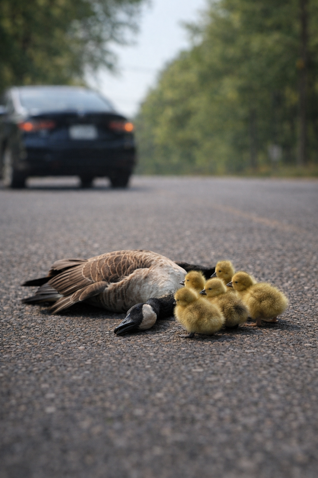 On the road behind it, the mother goose lay motionless.