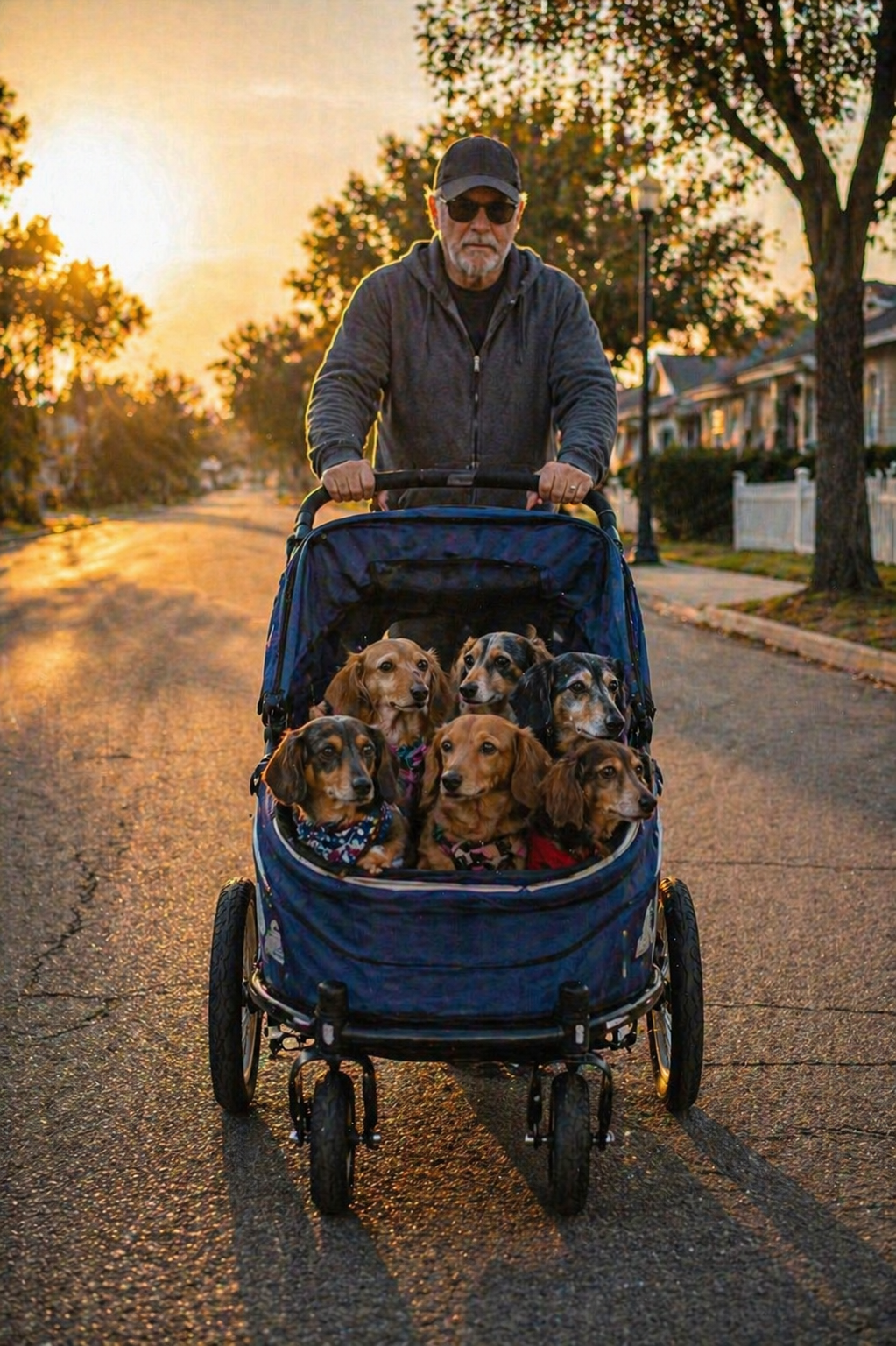 An older man, wearing sunglasses and simple clothes, walks at a steady pace. His hands grip the handle of a large blue pet stroller. From a distance, it looks like something you might expect to see in a park—a pet owner giving their dog a comfortable ride.
