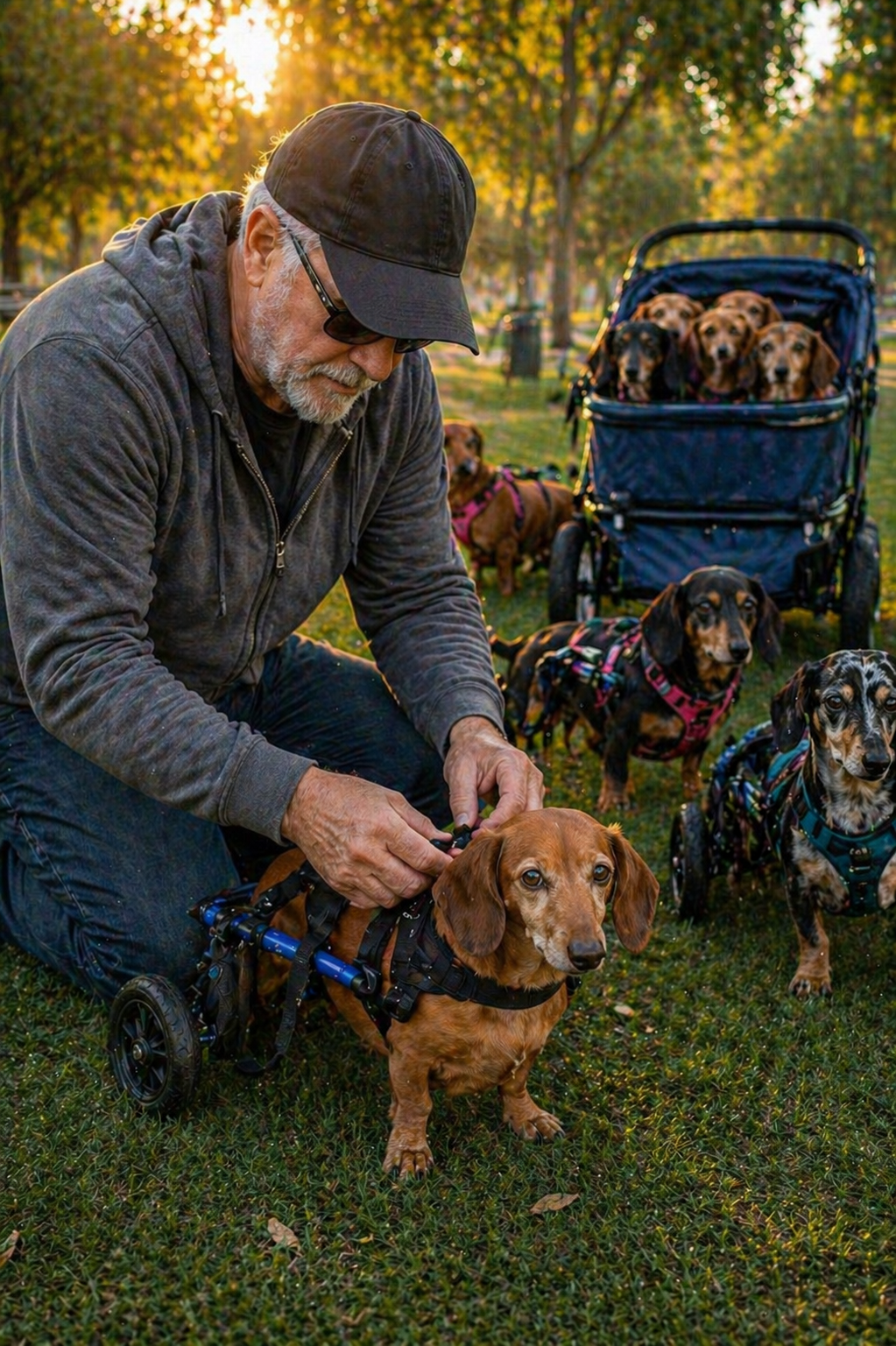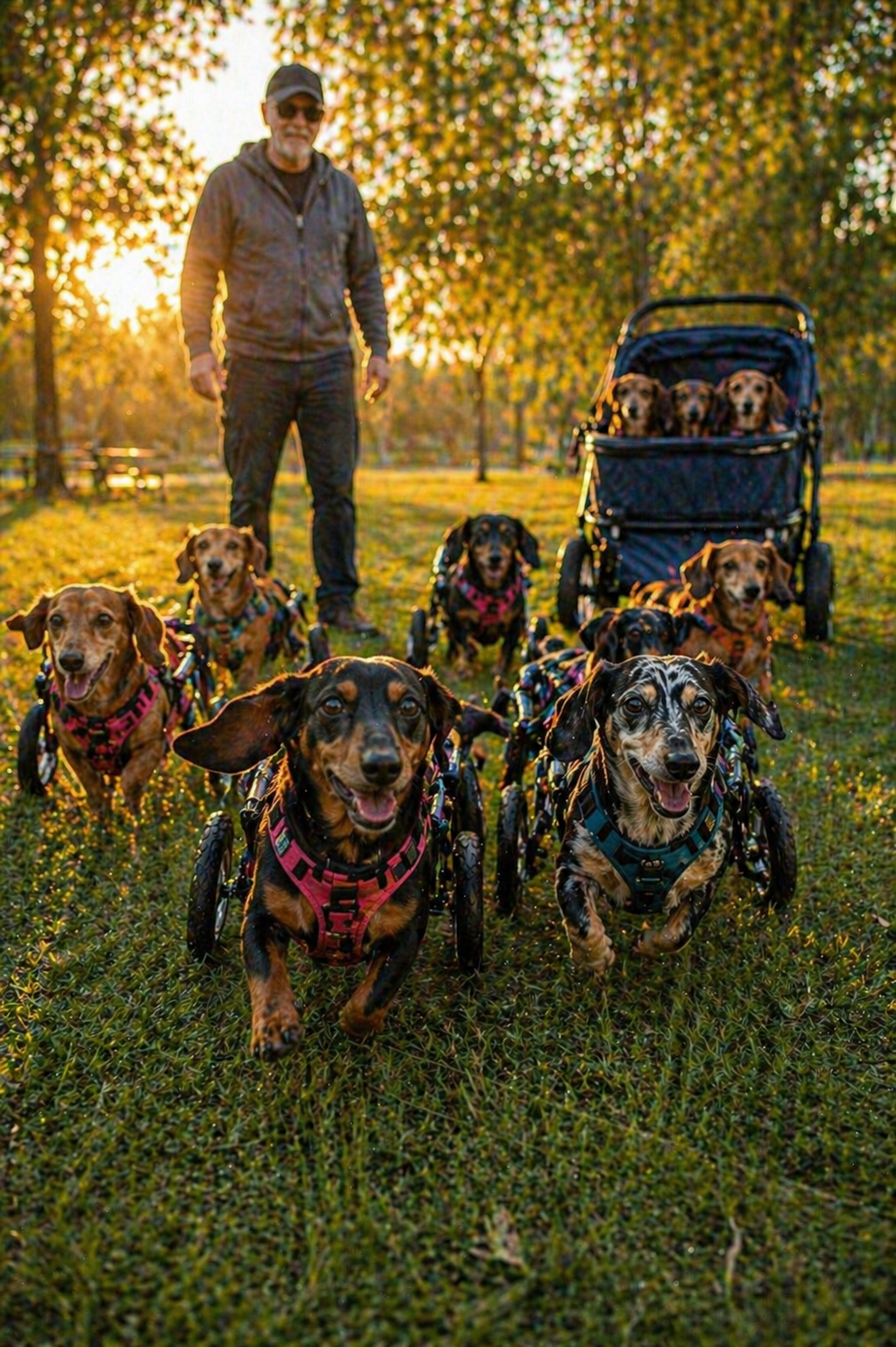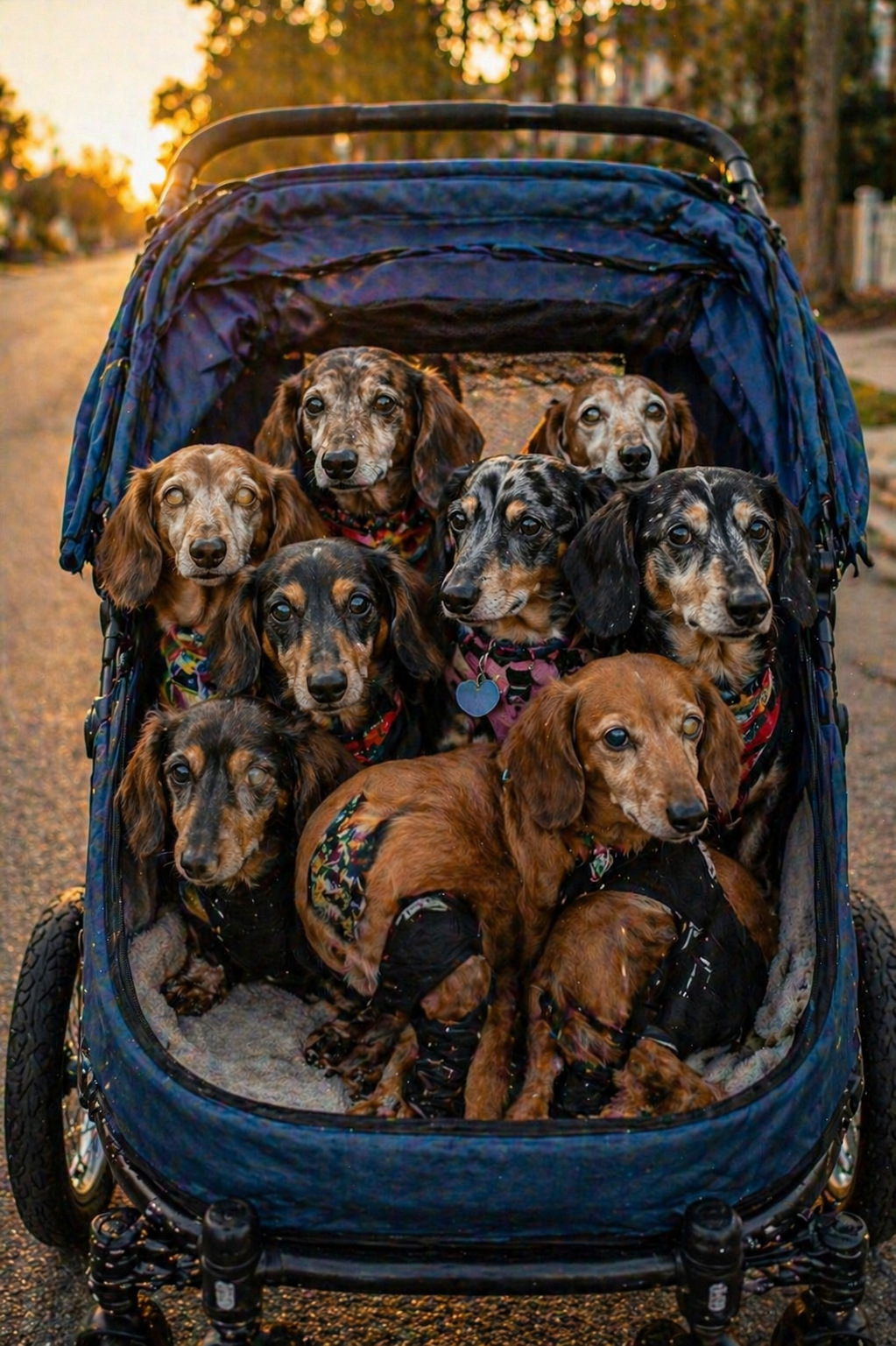 Small bodies packed close together, most of them dachshunds or mixes, sitting quietly as if they are used to this routine. Their heads lift slightly, their eyes alert, taking in the early morning light.