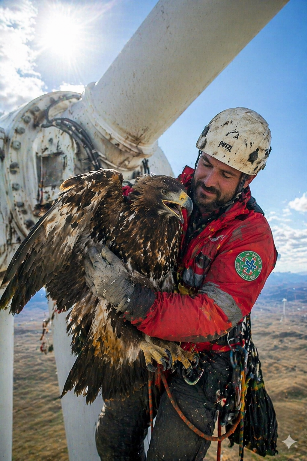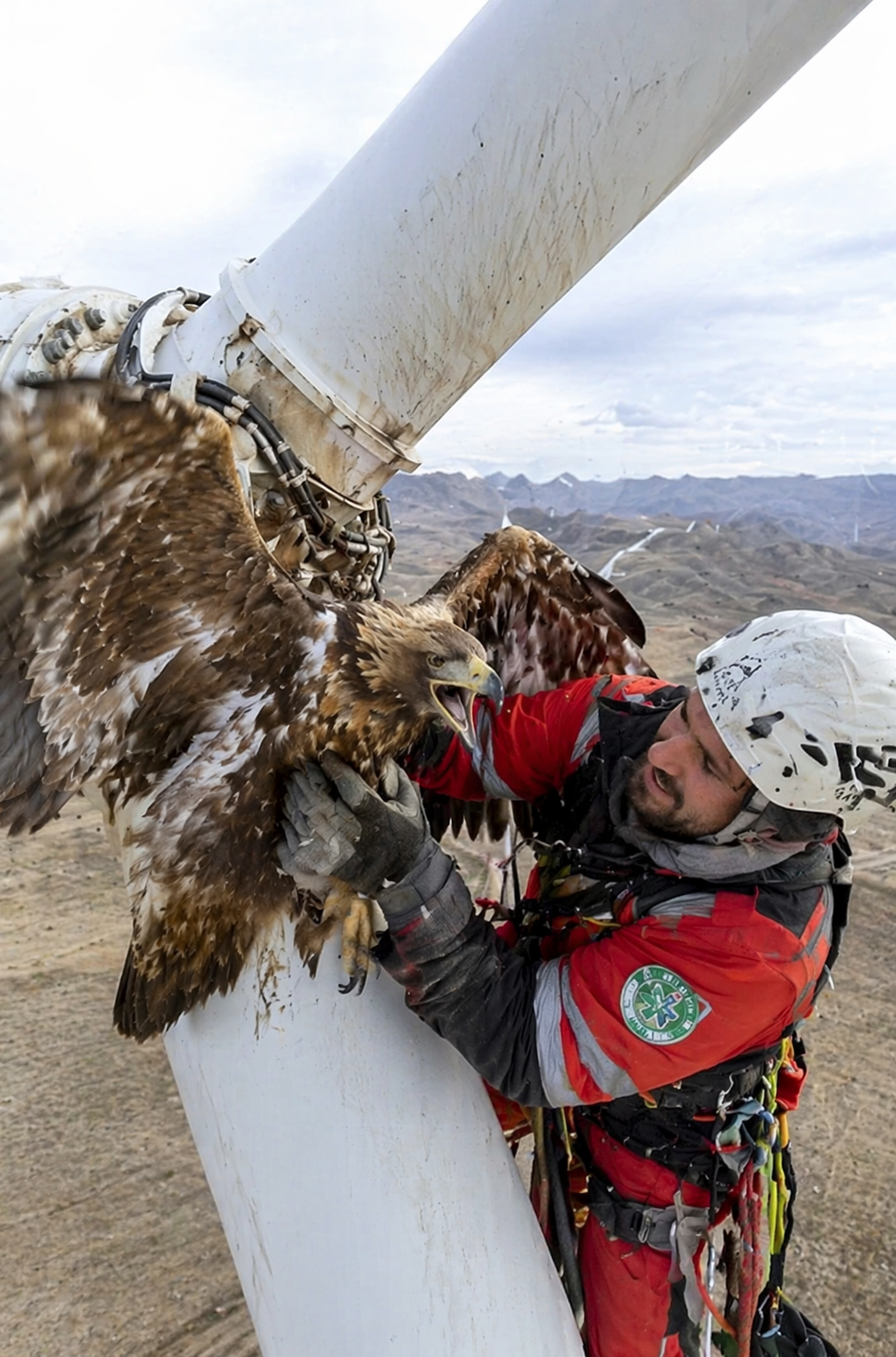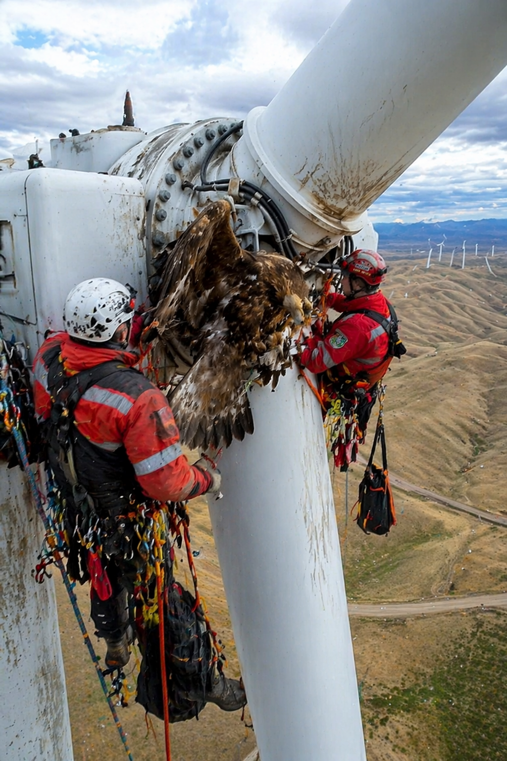 The eagle was still trapped, its body tense, breathing heavy, its strength slowly fading. Around it, the structure of the turbine made everything more complicated. Metal edges, tight spaces, constant movement from the wind.