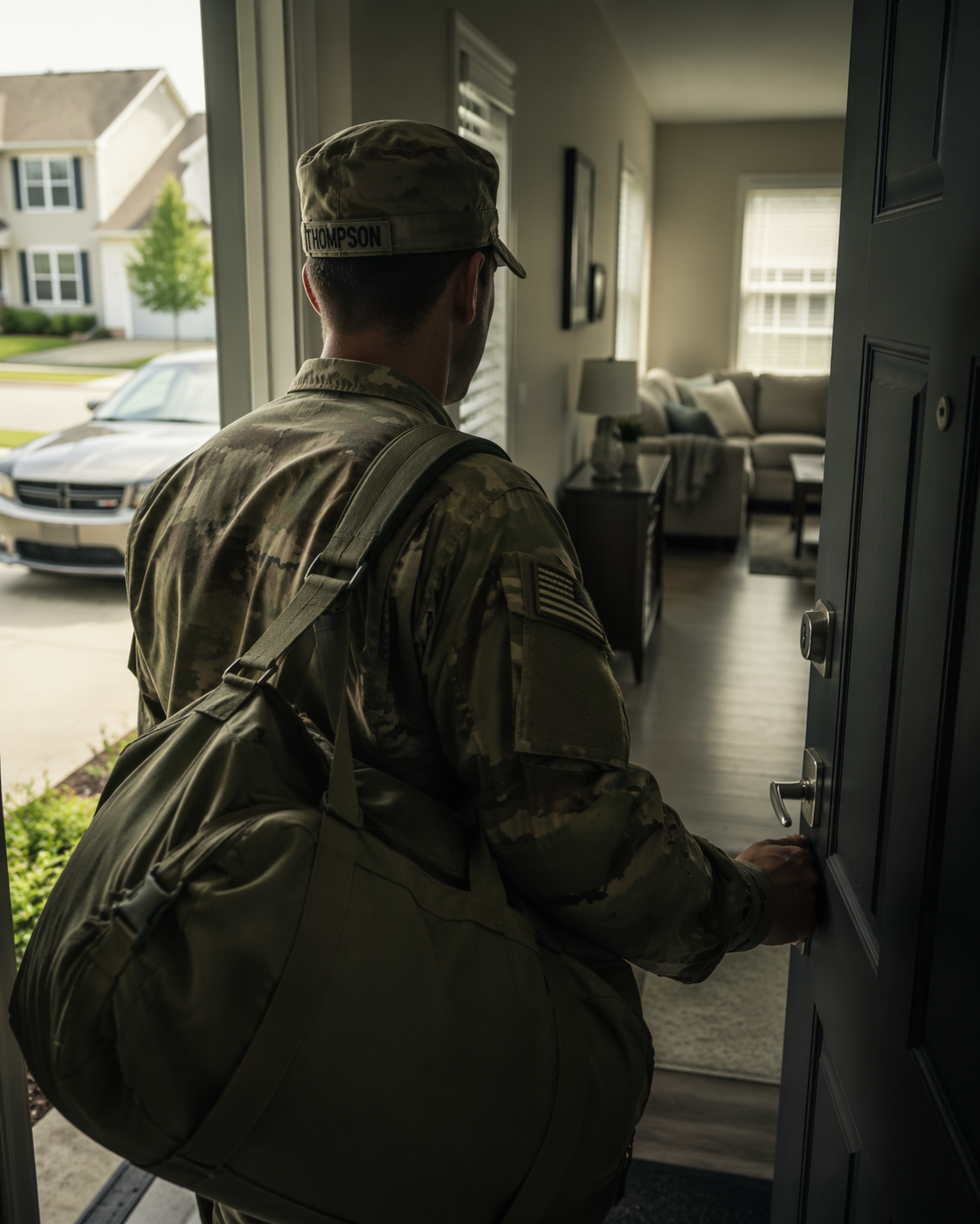 He stood at the door for a moment before opening it, his bag still on his shoulder, his uniform slightly worn from travel. He didn’t call. He didn’t warn anyone. He just wanted a simple surprise.