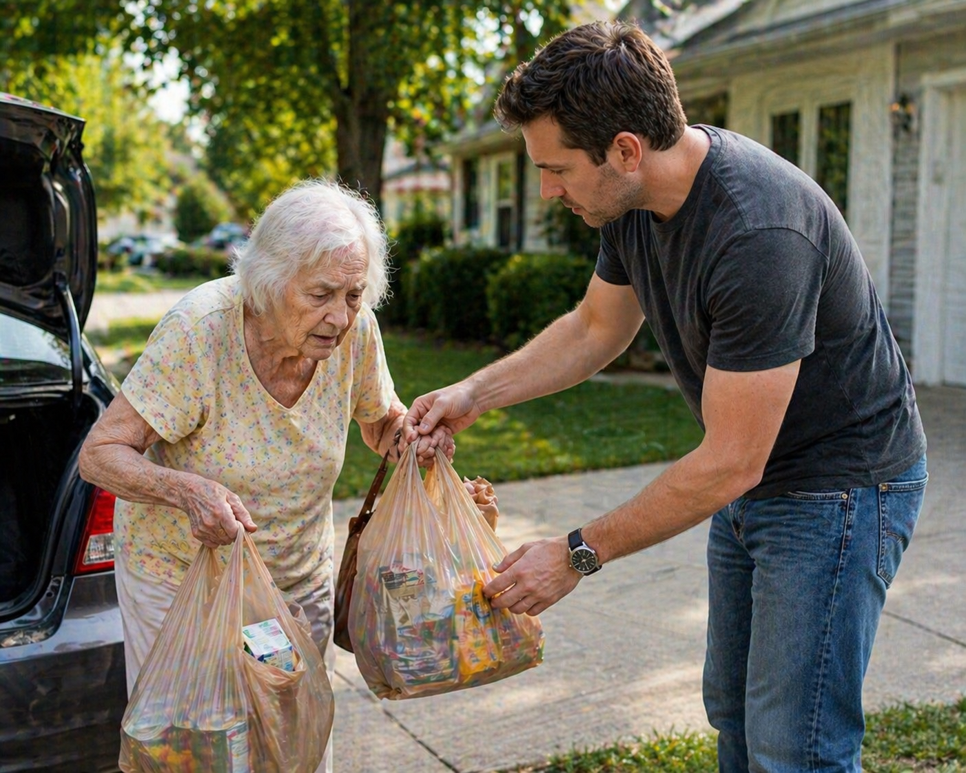 She had just parked her old car and was trying to carry too many grocery bags at once. Her hands were shaking, and every step looked difficult.