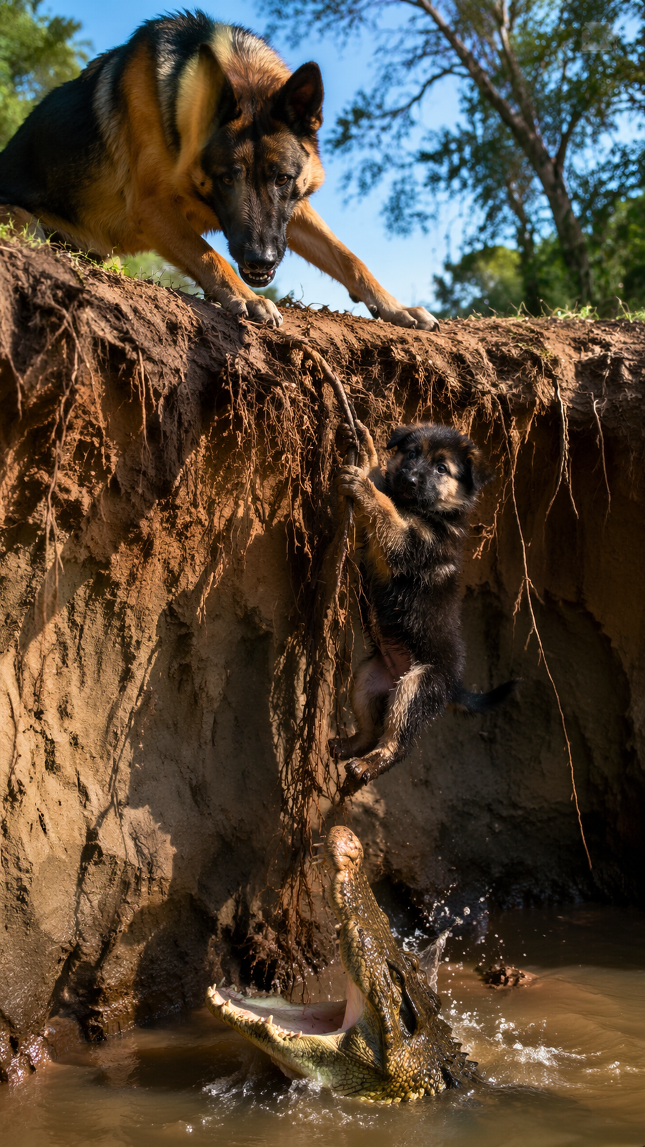 A small German Shepherd puppy was hanging from exposed tree roots, its tiny paws struggling to hold onto the loose dirt. Its body trembled, and every movement caused more soil to crumble beneath it. The grip it had wasn’t strong. It wasn’t secure. It was temporary.
