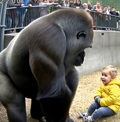 Then, with remarkable gentleness, the gorilla lowered his hand, not to strike, but to offer. He placed it on the ground palm-up, next to the little girl, a gesture that spoke of kindness and protection rather than threat.