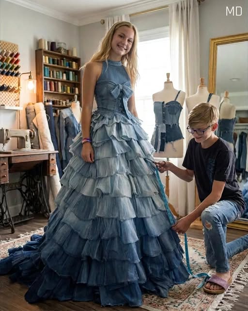 Noah carefully cut and stitched the denim pieces into a flowing design with different shades of blue and thoughtful details. The finished dress was unlike anything I had seen before—stylish, meaningful, and full of heart. When Carla discovered it hanging in my doorway, she laughed and predicted that everyone at school would make fun of it. Despite her reaction, I decided to wear it anyway, proud of what my brother had created.