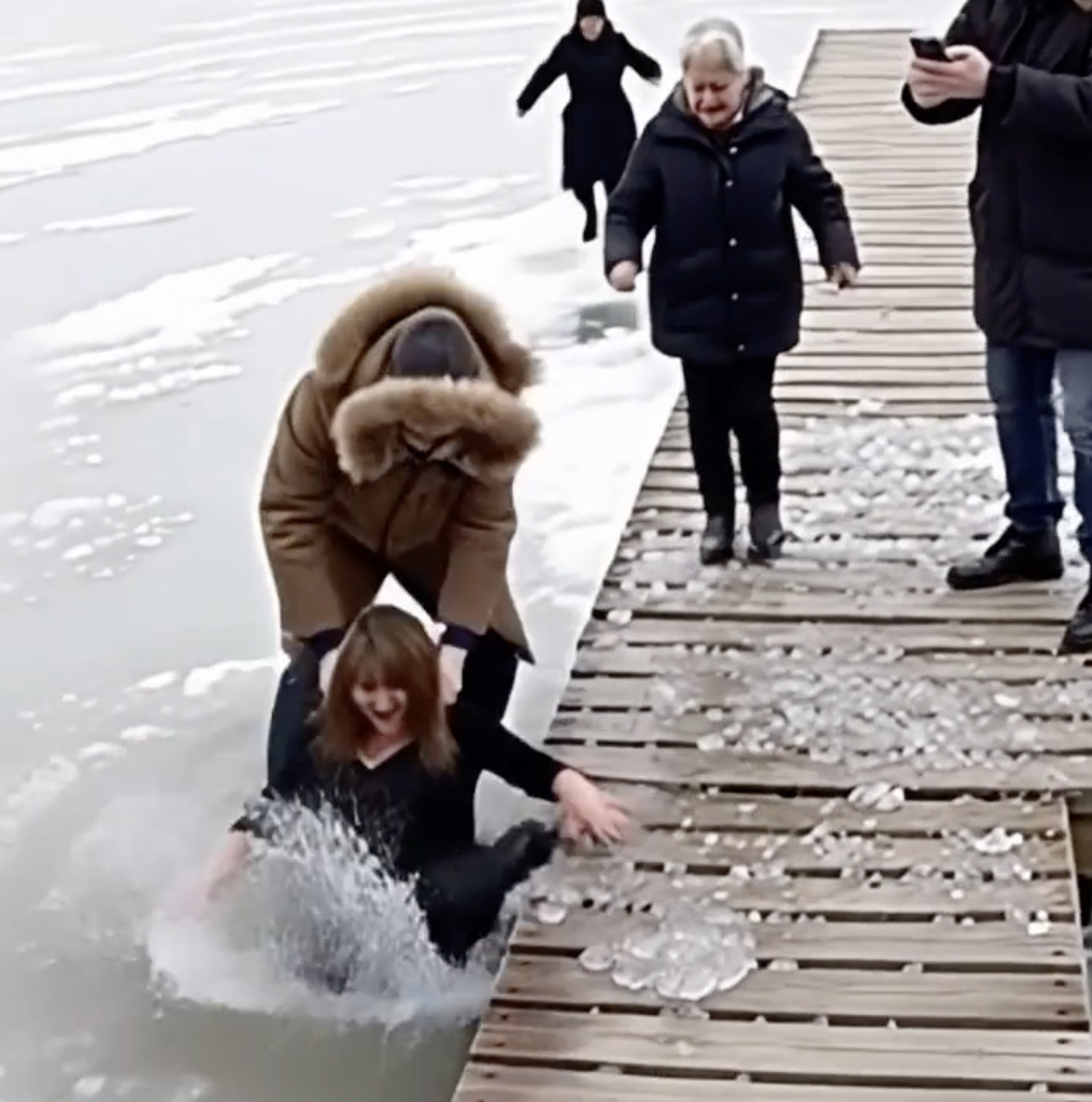 The laughter died as quickly as it had started, replaced by the shrill cries of panic. Brad’s phone slipped from his grasp, clattering onto the icy dock, forgotten in the chaos. Kyle and Justin froze, their expressions a twisted mix of fear and confusion.