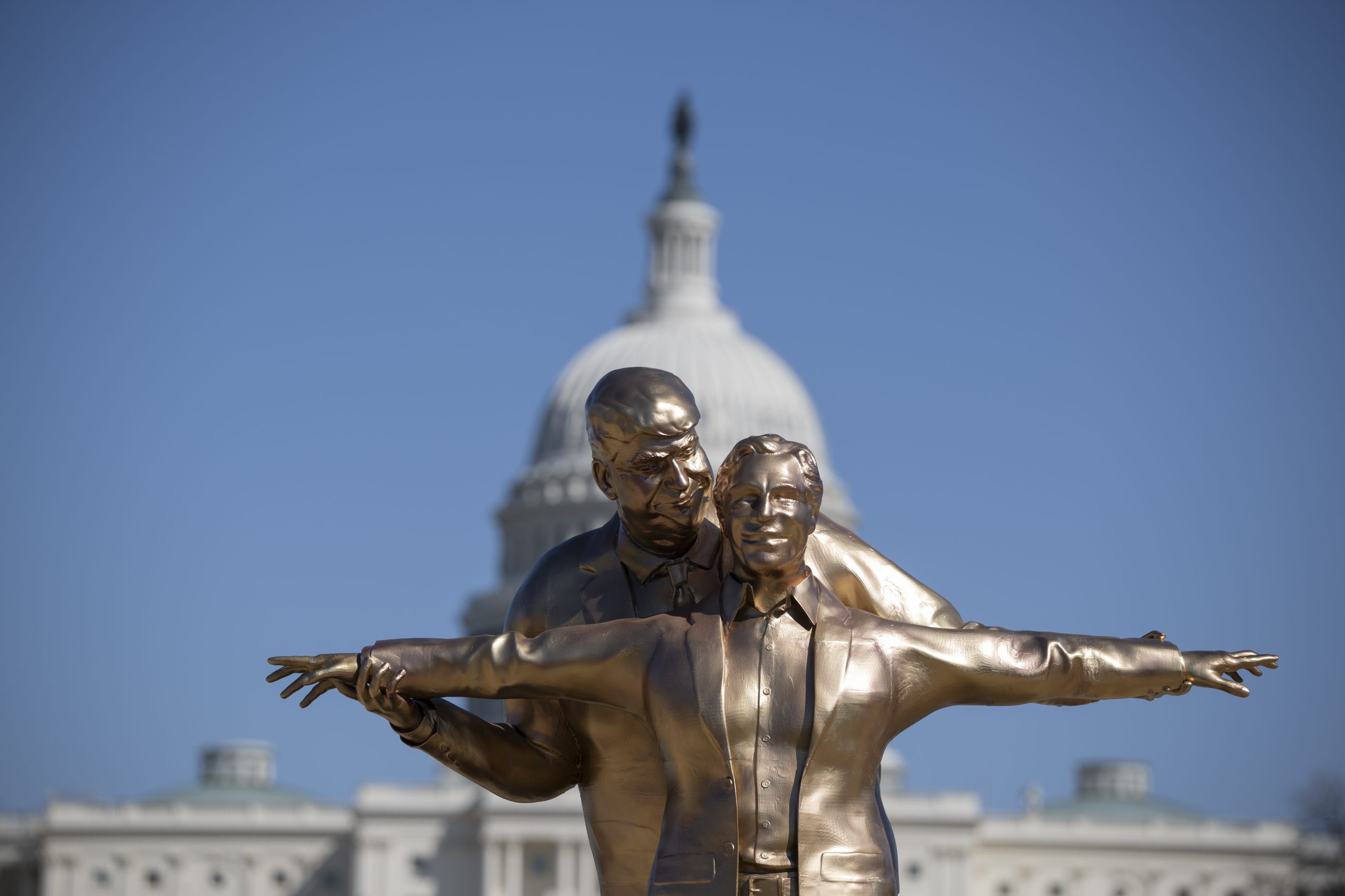 WASHINGTON DC, UNITED STATES – MARCH 10: A satirical statue depicting U.S. President Donald Trump and convicted sex offender Jeffrey Epstein in a âTitanicâ-themed pose is displayed on the National Mall in Washington, DC, on March 10, 2026. (Photo by Celal Gunes/Anadolu via Getty Images)