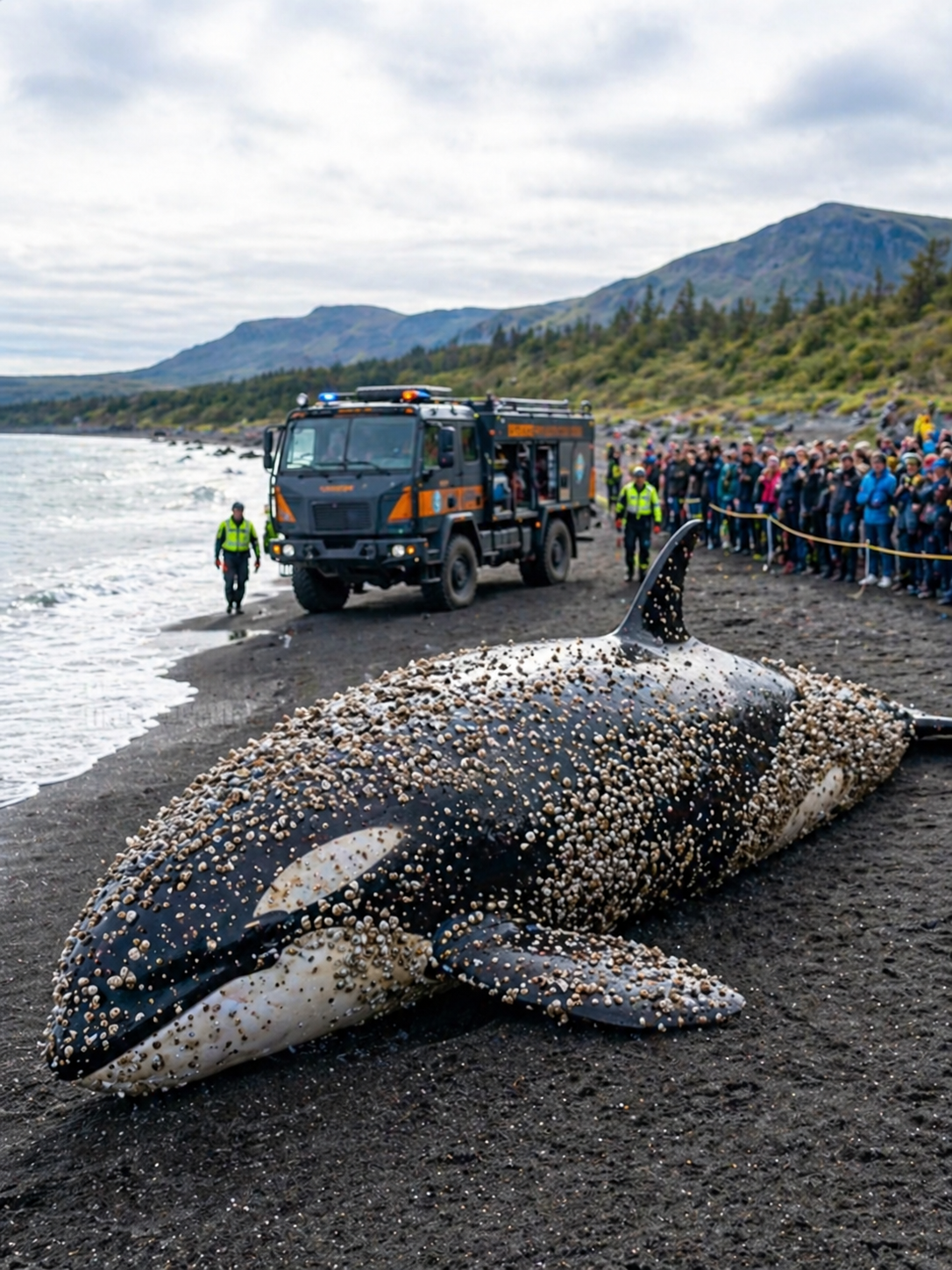 The orca lay near the waterline, massive and still, completely out of place on the dark volcanic sand.