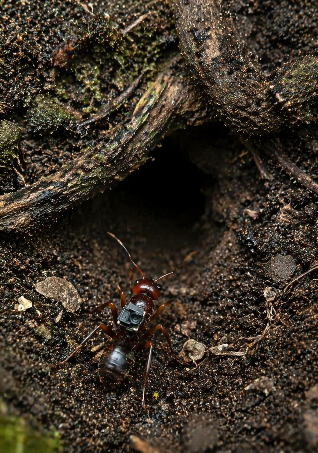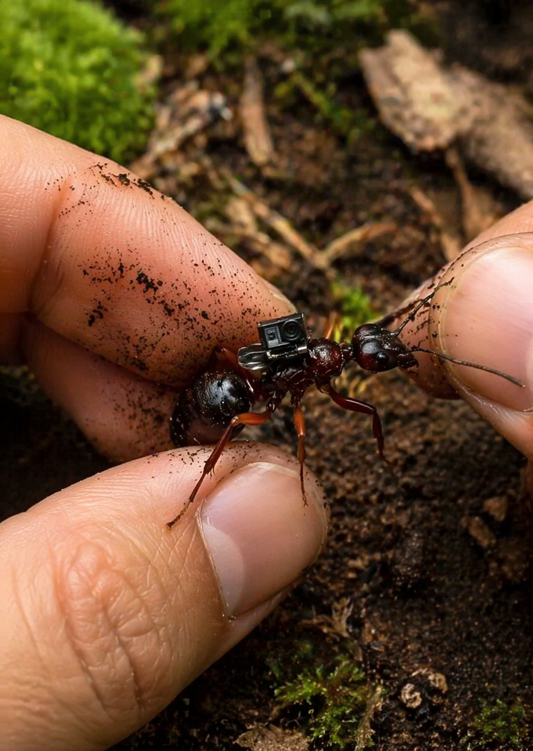 A tiny micro camera was gently attached to its back. So small it didn’t stop the ant from moving, so light it didn’t change its behavior. The ant continued to move its legs slightly, adjusting to the moment, but still calm.